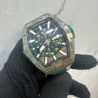 The Franck Muller Skafander™️ is a bold and innovative dive-inspired timepiece that combines high-performance engineering with standout aesthetics. Built using titanium, carbon, and stainless steel, it offers lightweight durability and modern appeal. The scratch-resistant sapphire crystal and deployment buckle add to its premium feel, making it the perfect fusion of sport and luxury.