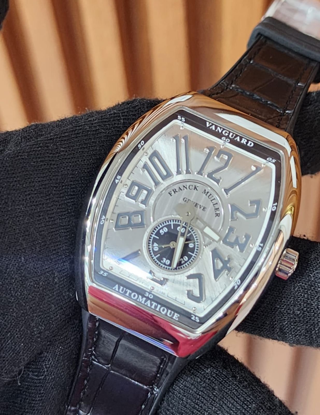 The Franck Muller Vanguard Slim Vintage combines classic elegance with modern sophistication, featuring a silver dial and an open caseback that reveals its automatic movement. The alligator leather strap, complemented by a silicon finish, adds a luxurious touch to this vintage-inspired piece.