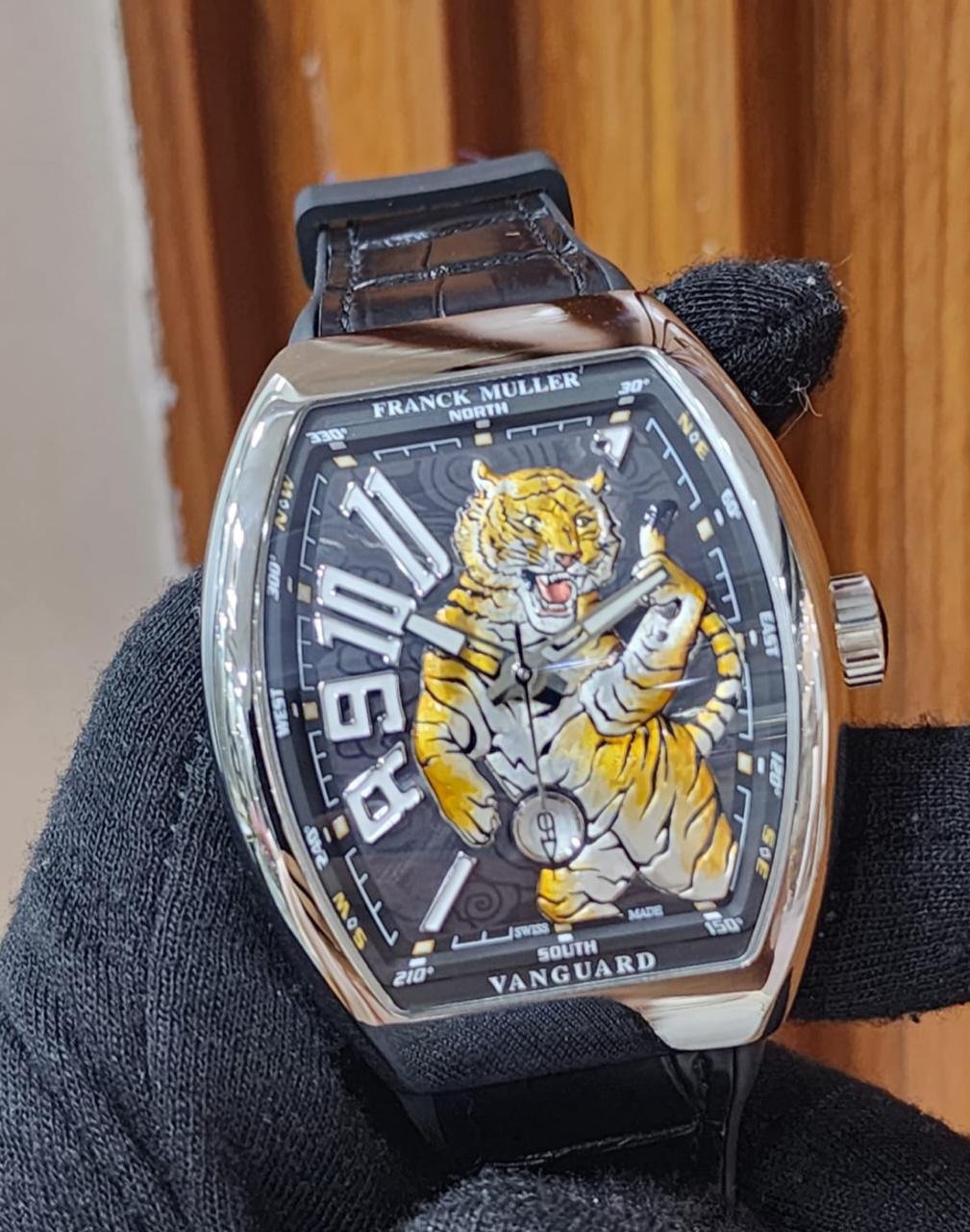 The Franck Muller Vanguard Tiger King stands out with its unique tiger-themed design. Featuring a bold 45 mm case and a luxurious alligator leather strap, it combines style and sophistication with a robust automatic movement.