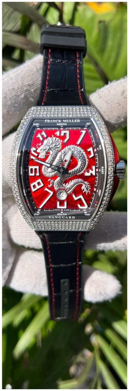 Introducing the Franck Muller Vanguard Dragon King Limited Edition, a masterpiece of horological artistry. This exquisite timepiece features a 45mm case adorned with 8.25 CT certified diamonds, making it a true statement of luxury and elegance. With its automatic movement, precise timekeeping is guaranteed, while the striking design ensures that all eyes will be on your wrist. Presented as a brand new full set from 2024, this watch is ready to be cherished by its new owner. Don’t miss the opportunity to own a piece of horological history with the Franck Muller Vanguard Dragon King Limited Edition.