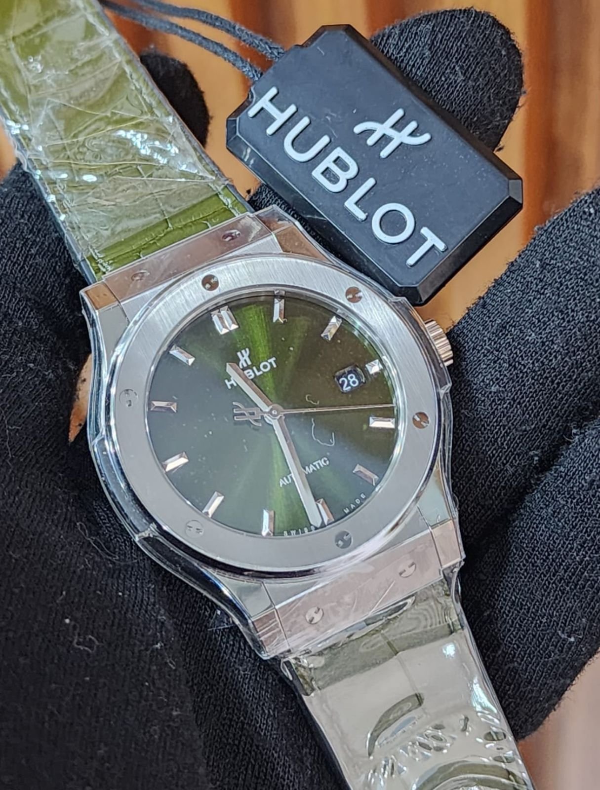 The Hublot Classic Fusion in green offers a fresh, modern take on luxury, complete with a matching green leather strap. Perfect for those who want a unique timepiece that stands out.