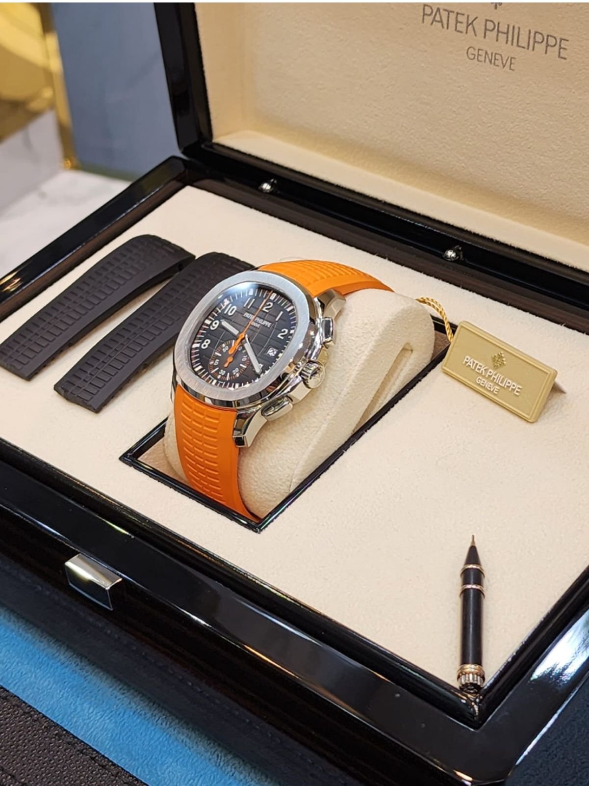 The Patek Philippe Aquanaut 5968A is a masterpiece of luxury sports watchmaking, combining elegance with functionality. This model features a striking chronograph with a date display and is complemented by the versatility of an uncut orange strap, along with an additional black strap. Powered by Patek Philippe’s in-house movement, this watch is a true collector’s item, presented in brand-new condition with a full set from 2020.