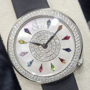– It has a pavé-set diamond dial with sapphire-set numerals at 3, 6, 9, and 12.
