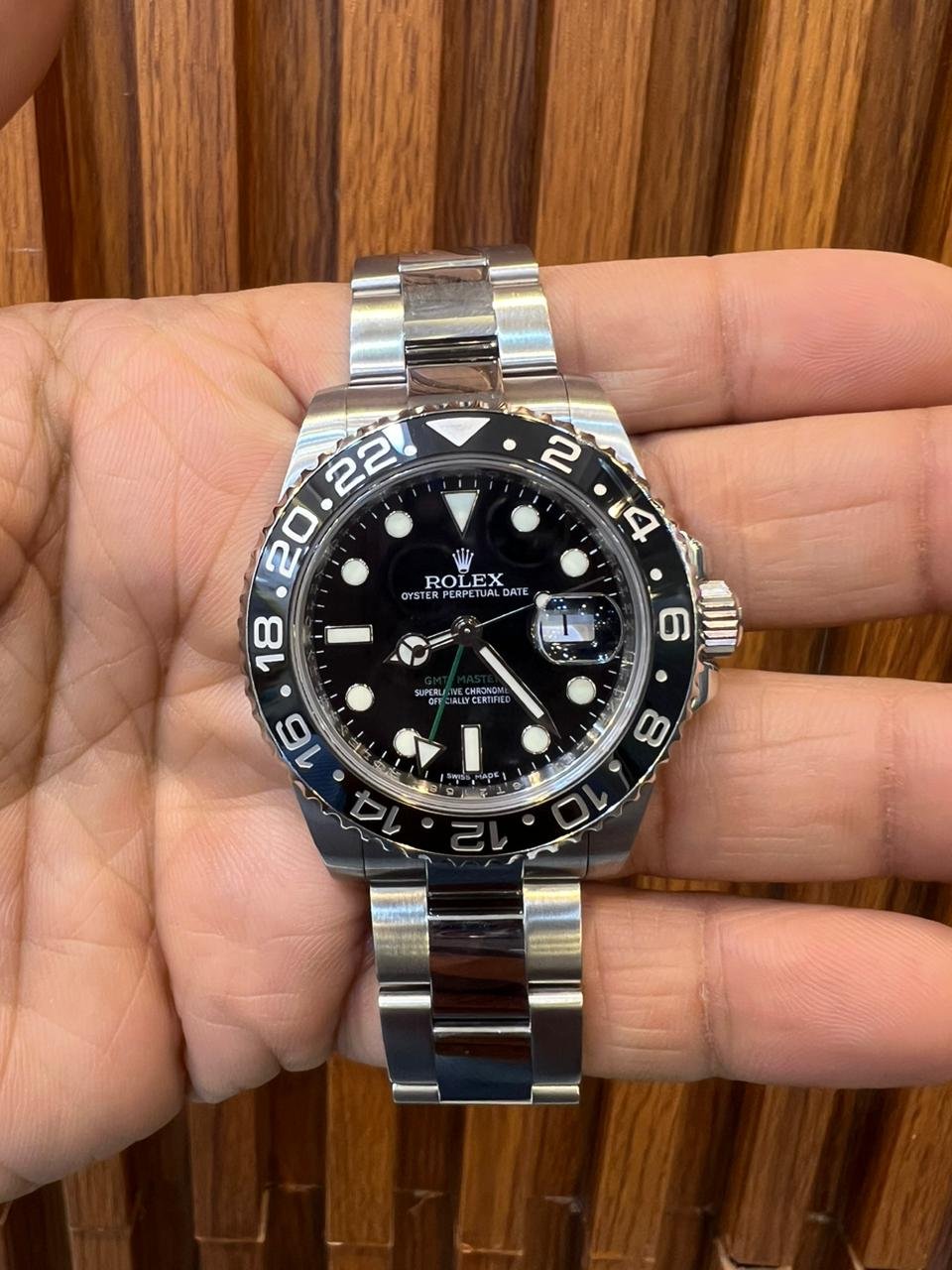 Embark on a journey with the Rolex GMT Master II. In pre-owned mint condition, this iconic timepiece, complete with watch and box, is ready to accompany you on your next adventure.
