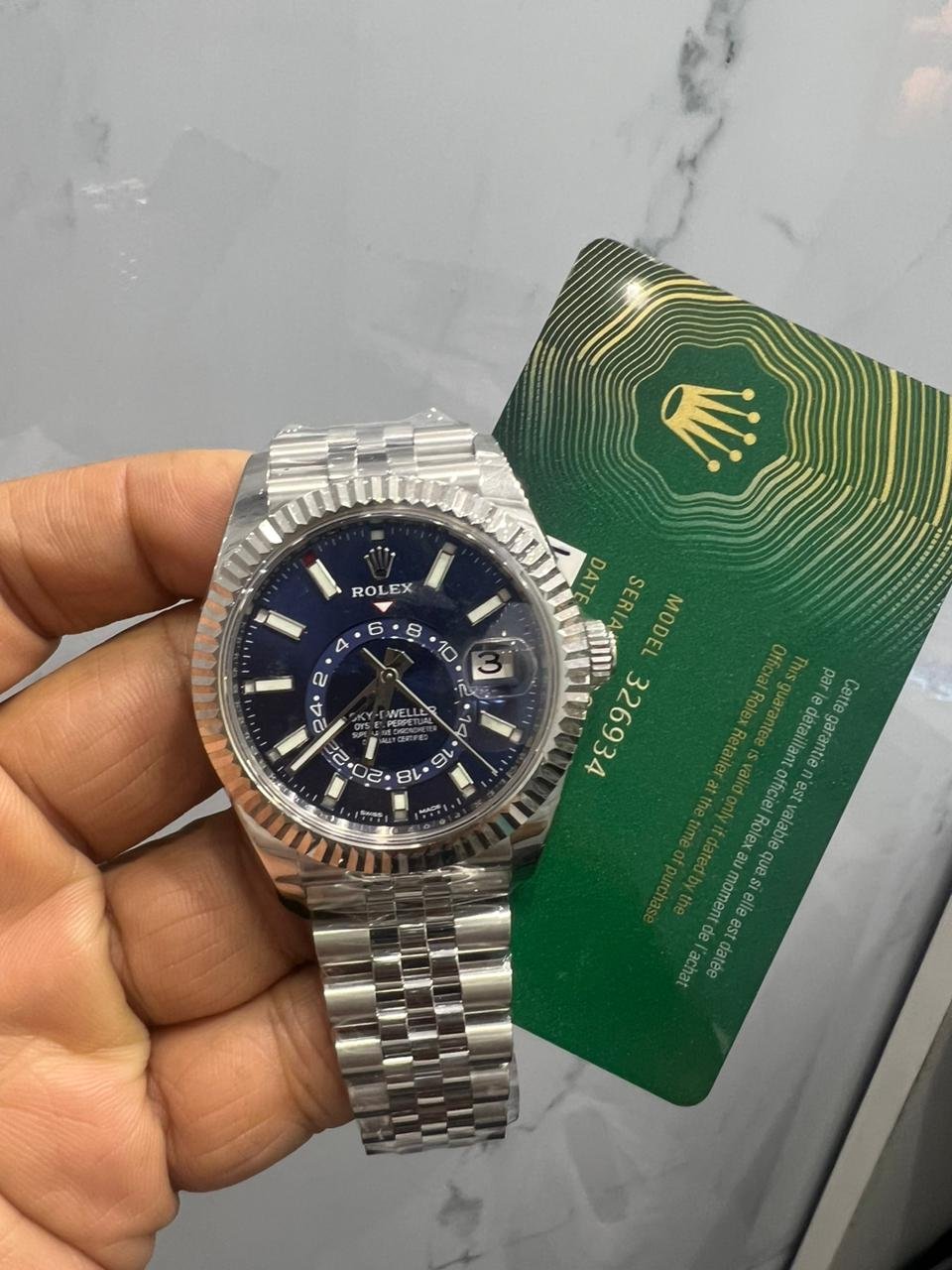 Indulge in the elegance of the Rolex Sky-Dweller 326934 with a captivating Blue Jubilee Dial. This brand new timepiece, fresh from October 2023, comes complete with a full set and a 5-year Rolex warranty for your peace of mind. It’s a symbol of luxury and assurance, perfect for those who appreciate fine craftsmanship and timeless style.
