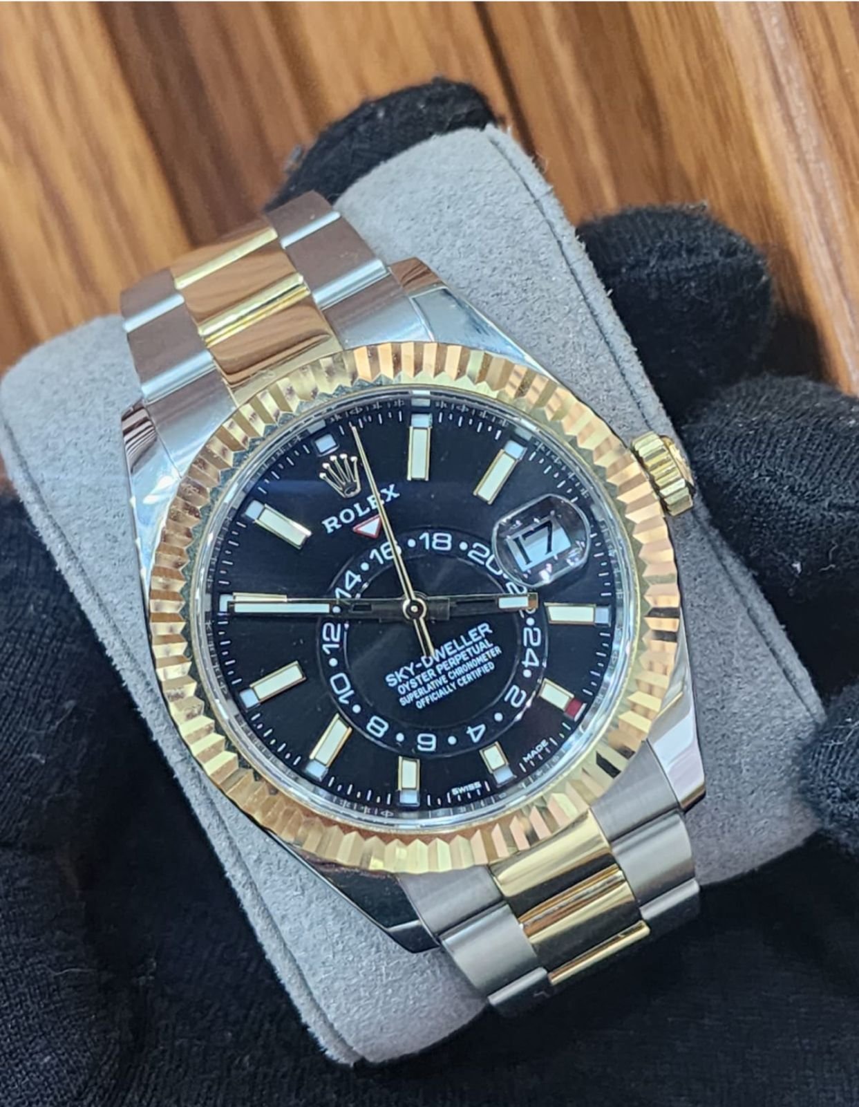 The Rolex Sky-Dweller is a perfect blend of elegance and functionality, ideal for frequent travelers. Crafted from oyster steel and yellow gold, this timepiece features a sleek black dial and is equipped with an ingenious mechanism that displays two time zones simultaneously. With its unique design and exceptional craftsmanship, this watch is both a sophisticated accessory and a practical tool for navigating time across the globe.